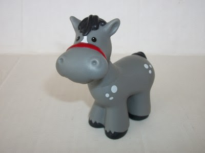 placing his little gray, Fischer Price toy horse